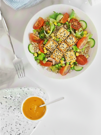 Sweetest chilli-mango vege bowl z grillowanym halloumi i ryżem z warzywami, posypany czarnym sezamem